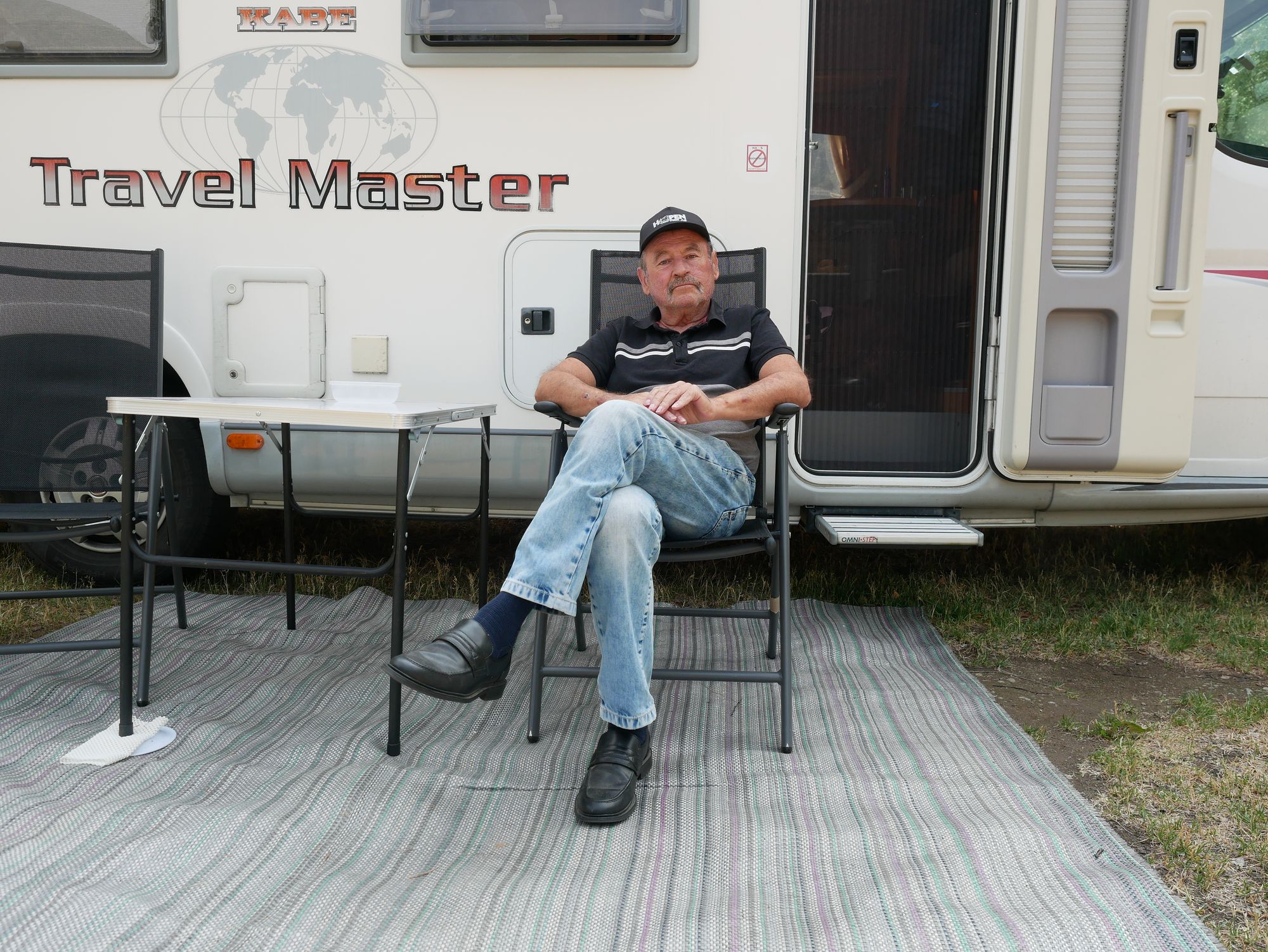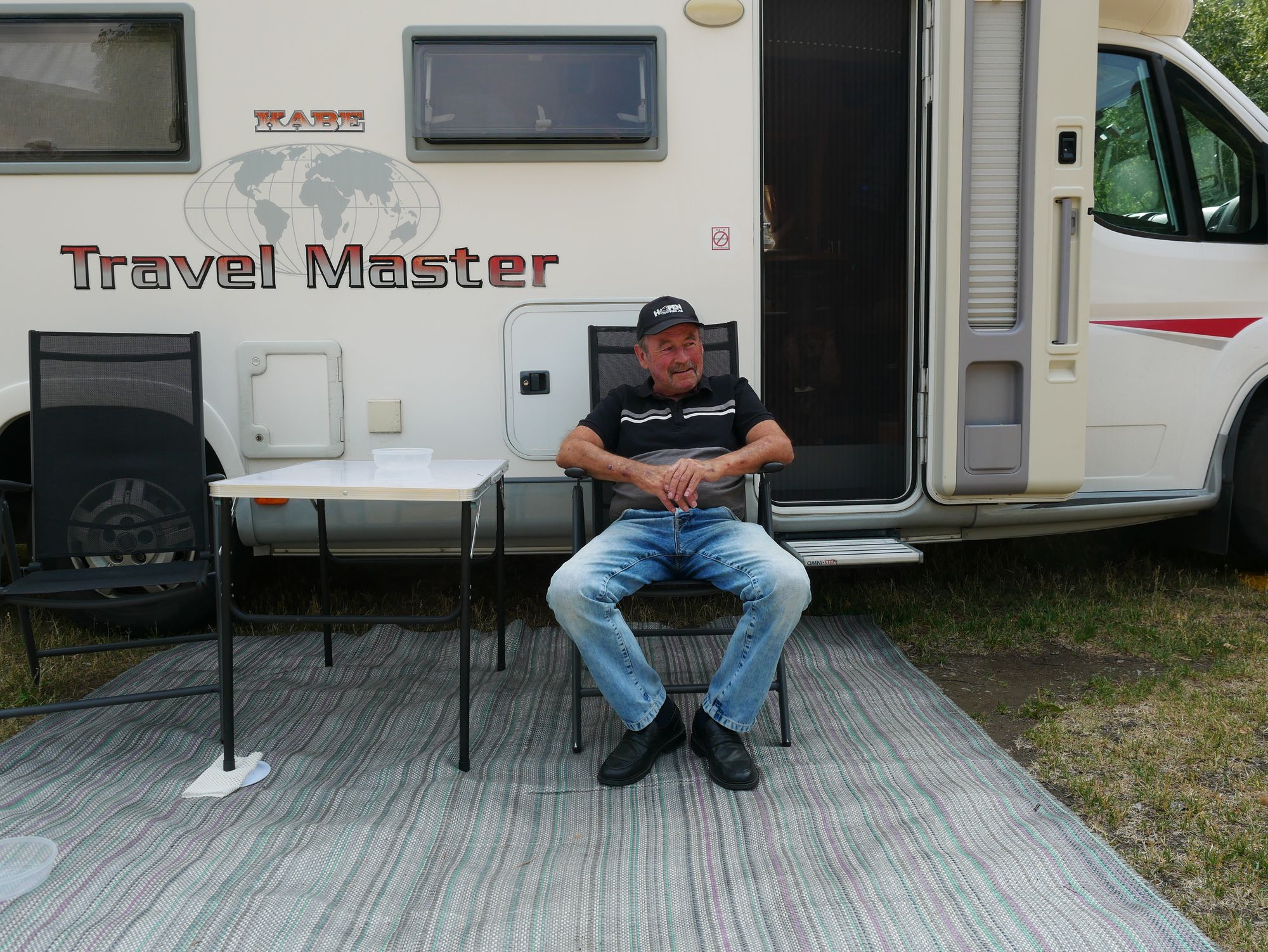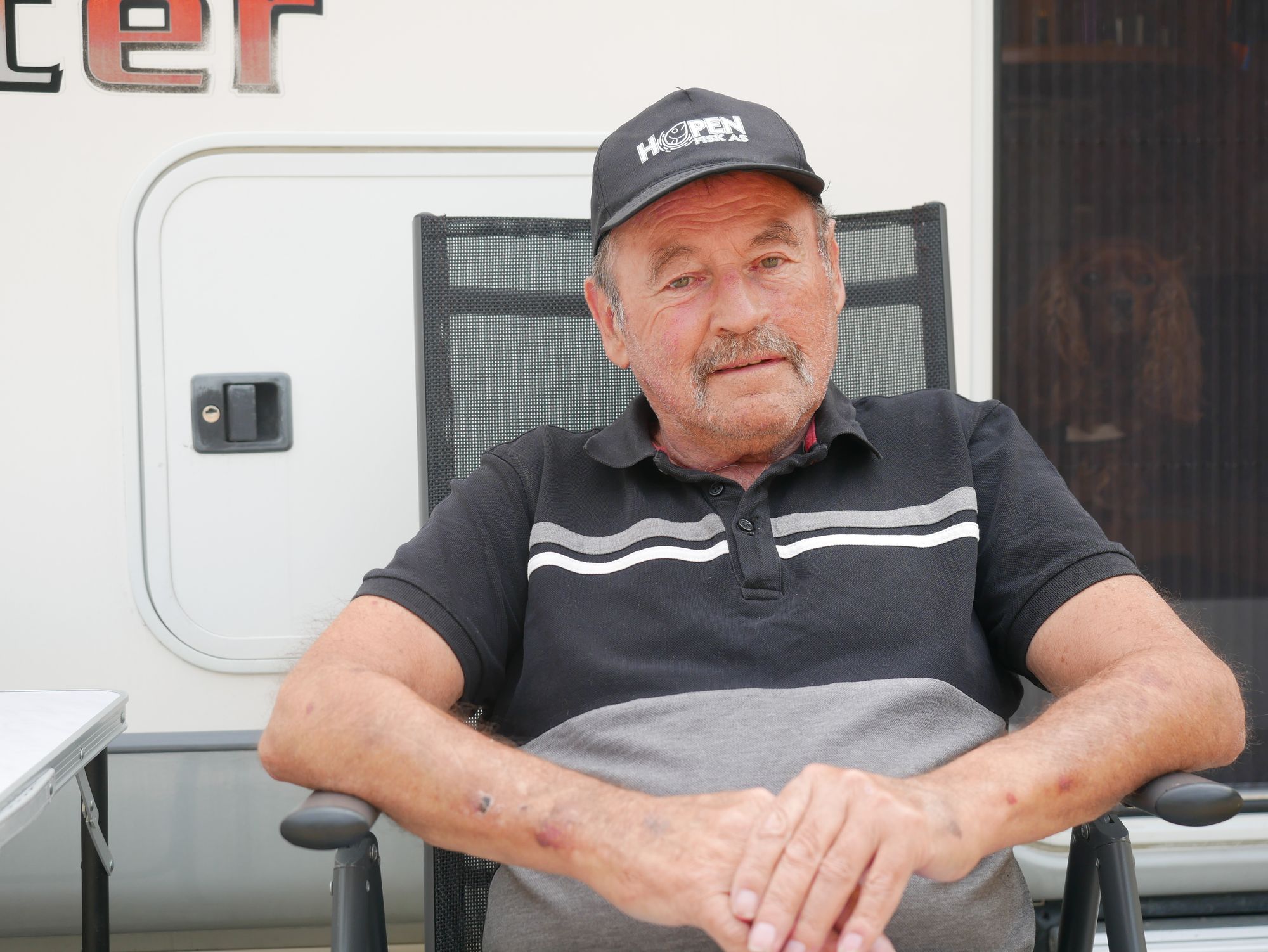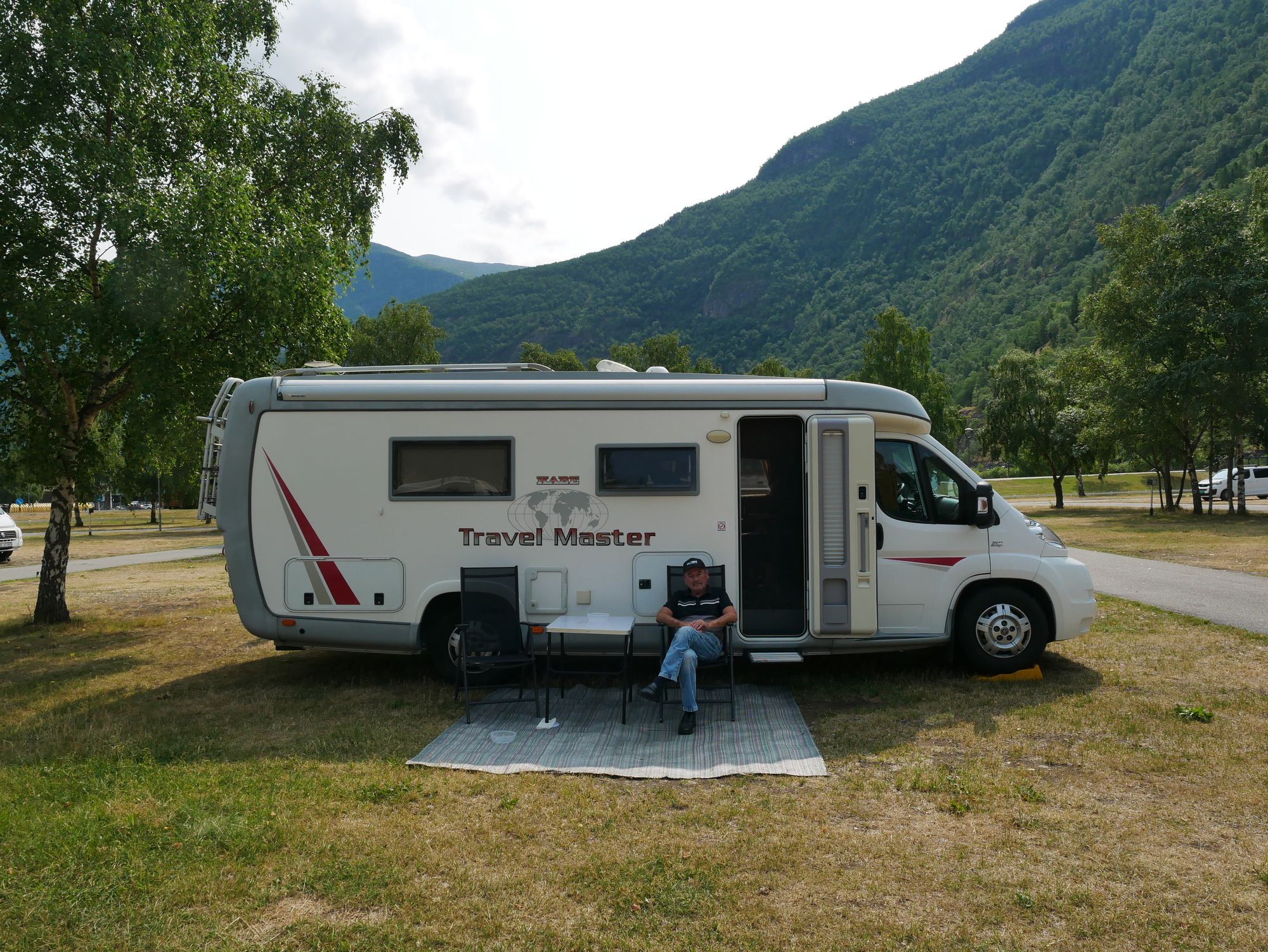 Johnny Nilsen serverer kaffi i campingvogna si i Lærdal. Han og kjærasten har vore på tur i 14 dagar. No skal dei snart heim igjen til Vaksdal.